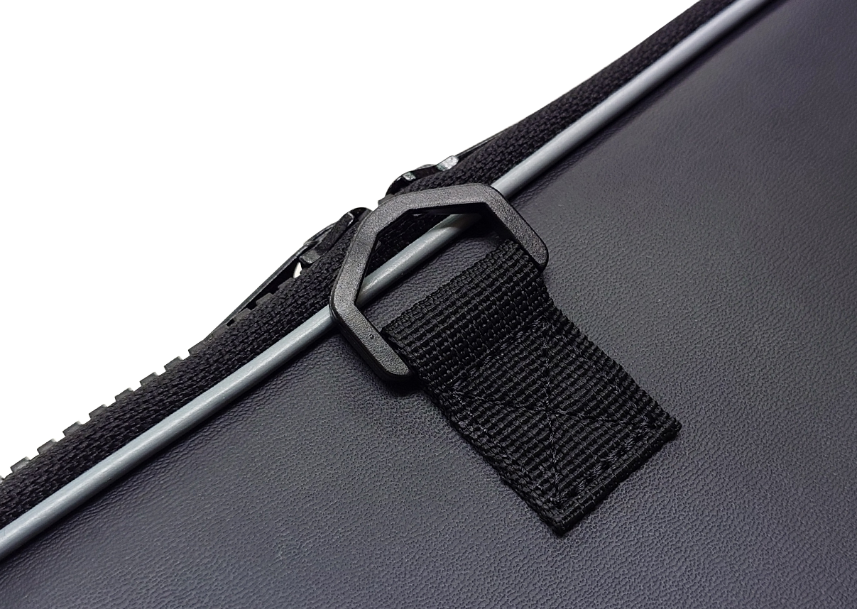 吊り下げに便利なDカンと、サイズ調整可能なループベルト付き